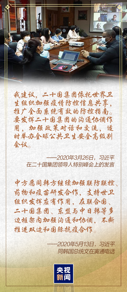 G20特別峰會上的發(fā)言《攜手抗疫 共克時艱》,第73屆世界衛(wèi)生大會視頻會議開幕式上的致辭《團結合作戰(zhàn)勝疫情 共同構建人類衛(wèi)生健康共同體》,中非團結抗疫特別峰會上的主旨講話《團結抗疫 共克時艱》,縱觀習近平主席三次國際會議的講話,團結攜手之意貫穿始終。